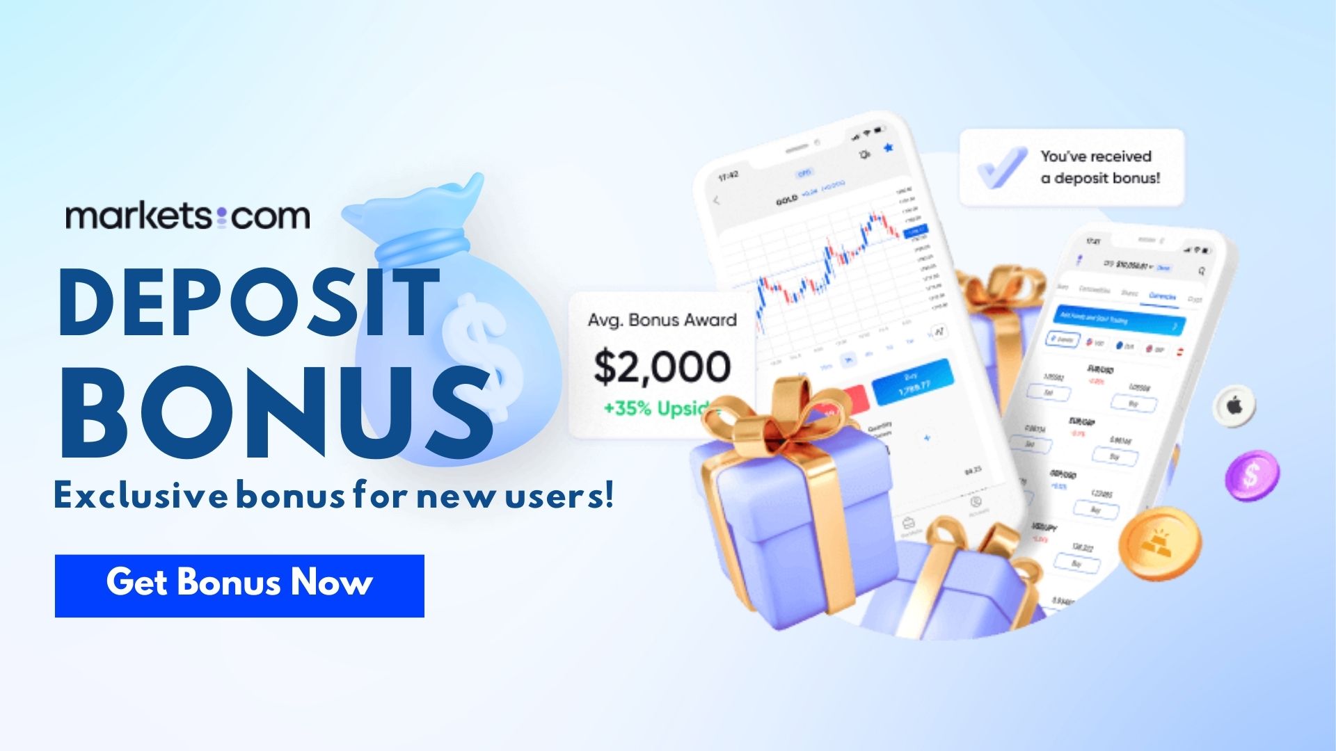 The $2000 deposit bonus program is a bonus for new customers When making a minimum deposit Under real trading conditions offered by Markets.com Trade with a larger pot, with our 20% deposit bonus ! So can energize your trading and profits made while trading with the bonus are yours.